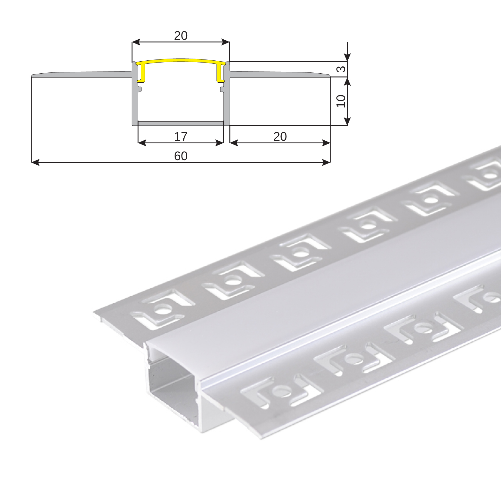 Hliníkový zápustný profil pre LED pásy. Profil sa dodáva vrátane mliečneho polykarbonátového difúzora, ktorý zabezpečí rovnomerné rozptýlenie svetla. Vhodný pre LED pás do šírky 16mm. Produkt je je dopstupný v dĺžke 1 a 2m. Prierez 60x13mm.